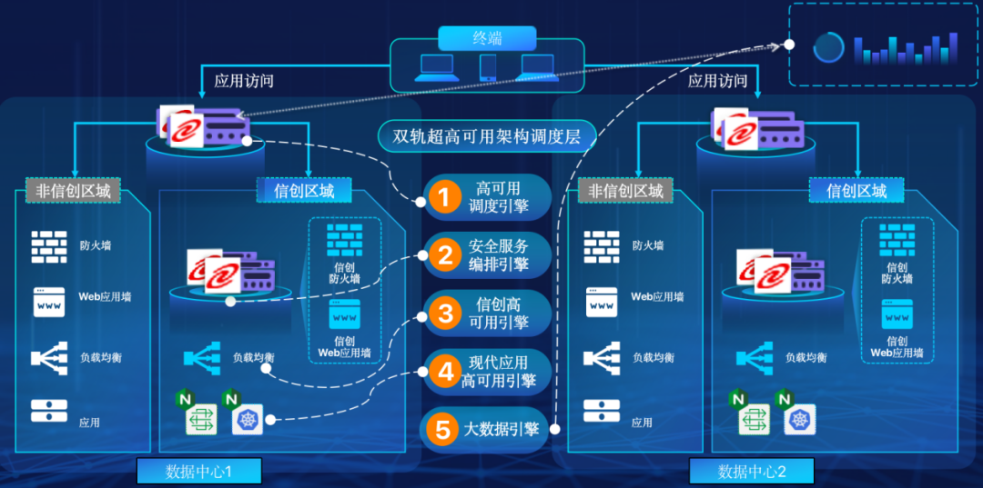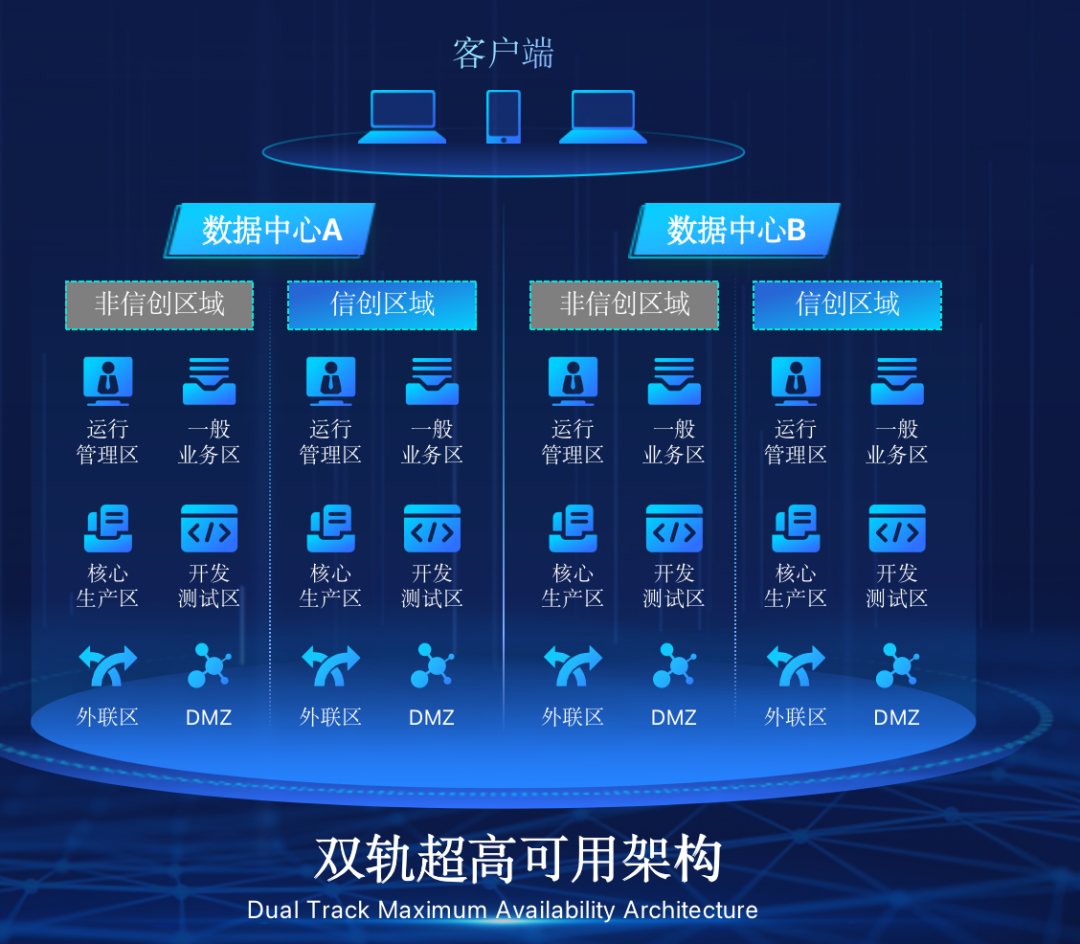 k8凯发在企业面临自主创新IT基础重构过程中,推出的全新架构双轨超高可用架构(简称DTMAA),在双活数据中心的分区调度基础上,添加每个数据中心内信创域和非信创域的分域调度,来实现分区分域协同的多活双轨超高可用。